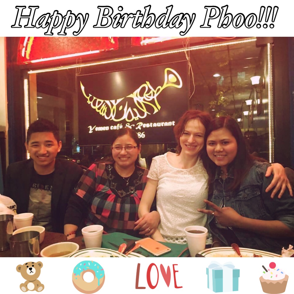 Yesterday was Phoo Phoo’s Birthday!!! We celebrated her birthday in a Yemenis Restaurant in Brooklyn Heights. The food was so delicious and the atmosphere was just beautiful! Phoo Phoo is from Myanmar and yesterday she turned 21 years old!